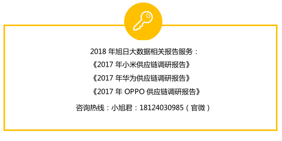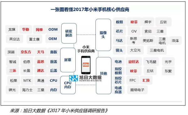 下图是旭日大数据整理的一张关于小米2017年核心零部件的供应商图,从我们监测的数据以及市场调研情况来看,2017年,大部分小米的核心供应商无疑都是获益的。但限于文章篇幅,只挑部分供应商进行分析。
