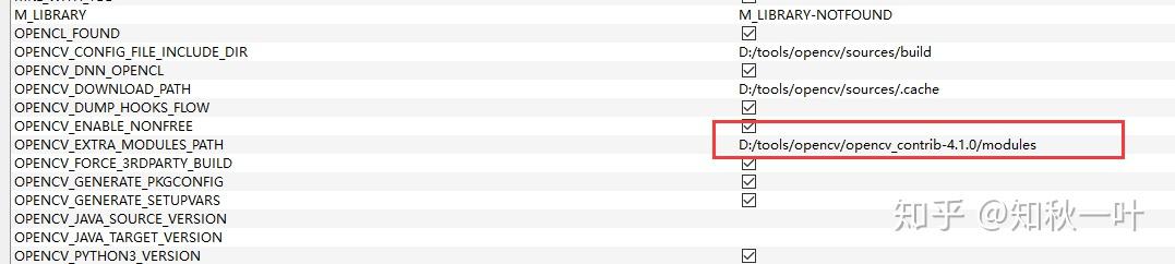 其中在选项OPENCV_EXTRA_MODULES_PATH 的值修改为contrib-4.1.0的modules的路径