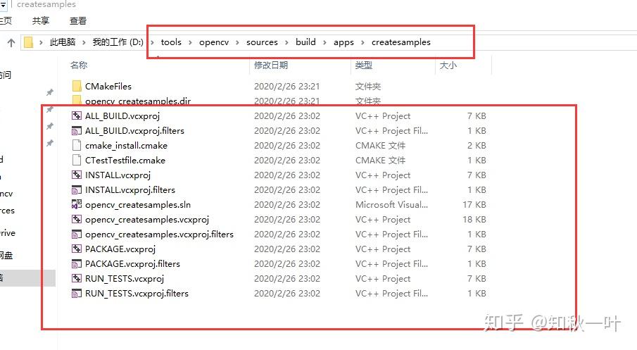 到此时基本最重要的事情结束了,到目录下确认这两个工具源码是不是正确,如图目录下,确保在/opencv/sources/build/apps/createsamples的目录下已经有了红框标识的文件(如果为空说明失败了,继续重复上面的步骤吧)