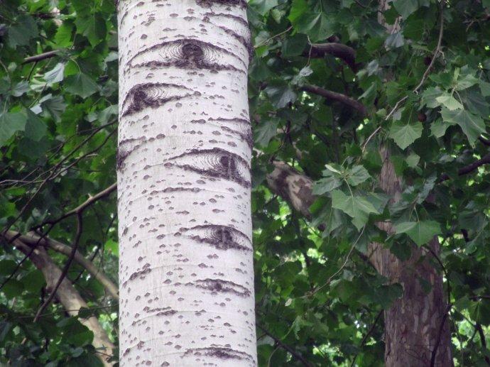 杨树的树疤,像一只只眼睛,大多都是树枝折断形成的,像这样: