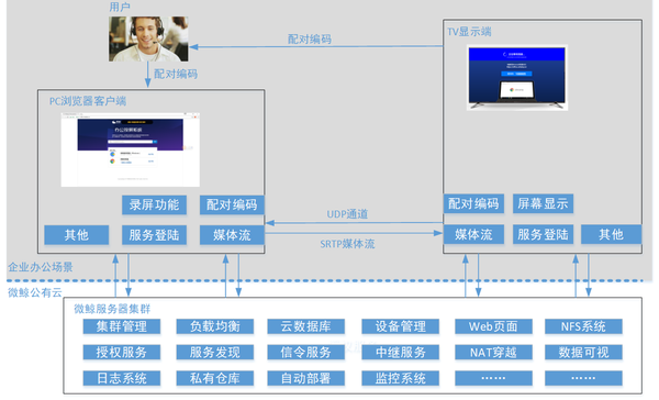 WebRTC,名称源自网页实时通信(Web Real-Time Communication)的缩写,是一个支持网页浏览器进行实时语音对话或视频对话的技术, 鲸联-办公投屏功能基于WebRTC框架技术,独家专利实现了云投屏,解决办公人士对于无线办公投屏的需求需求,做到真正的无限投屏(不限地点、不限网络、不限个数) 。