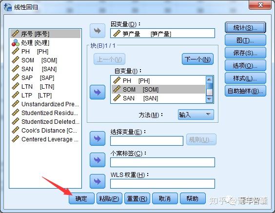该研究想建立变量(pH、SOM、SAN等)与产量之间的回归方程,此时我们可以考虑采用多元线性回归分析。