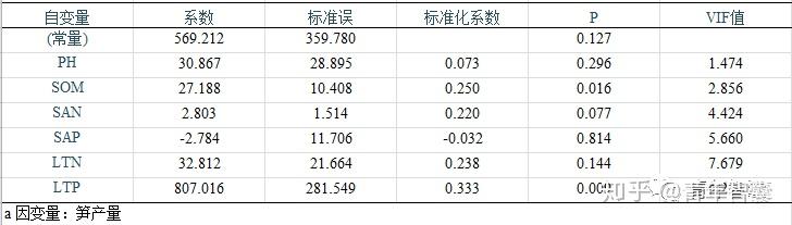 本案例以土壤pH值、SOM、SAN、SAP含量和叶片LTN及LTP含量为自变量,笋产量为因变量进行多元线性回归分析。结果表明,回归模型具有显著的统计学意义(F=48.177,P<0.001),自变量能解释作物产量变化的90.7%,具有较高的解释度。显著性检验结果表明,SOM和LTP含量对作物产量的影响具有统计学意义(P<0.05,如下表)