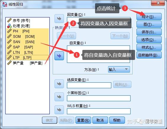 2.将pH等自变量选入自变量框,将产量选入因变量框,点击统计。