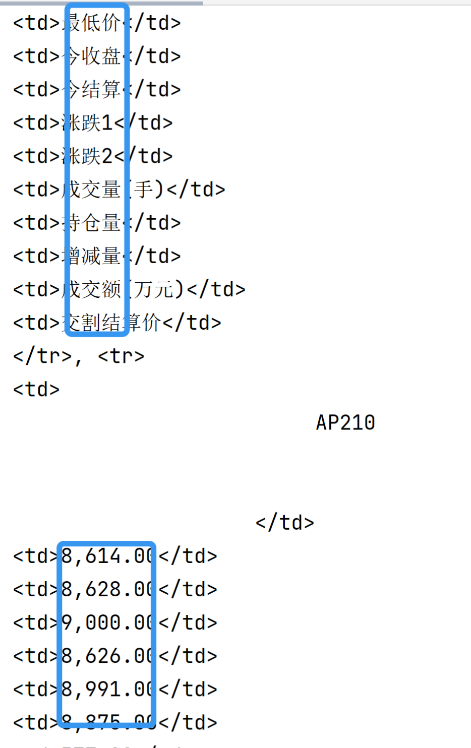这样我们就解析出了所有的<tr>的内容。可以观察到我们想要的数据都存在于<td>之间 :