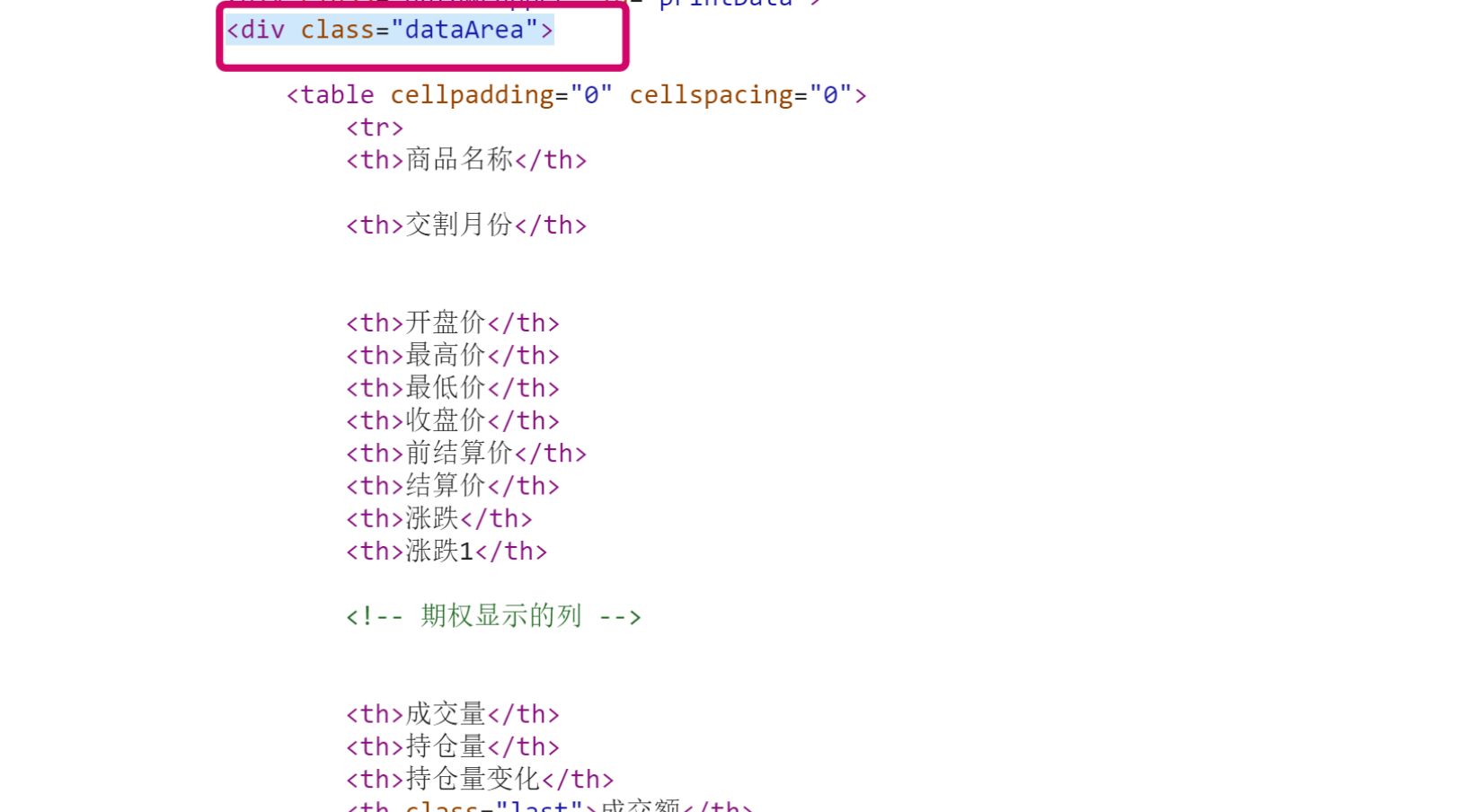 我们查看页面代码可以发现数据都保存在'dataArea'这一class内。我们需要利用 driver.find_element 函数按类名将数据取出。