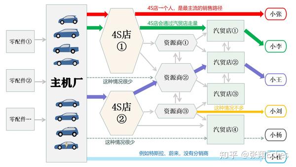 再先放一张我画的 “汽车销售通路” 图示,让你大致了解,汽车卖给个人消费者的路径,或者说个人消费者可以买到车的路径。