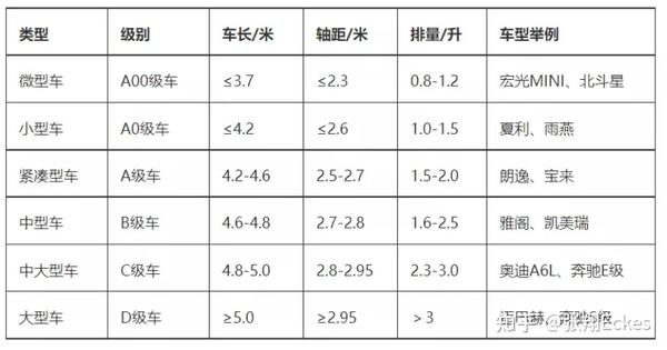 狭义上的汽车(家用车、乘用车),基于车身尺寸不同,有一些“紧凑型车”“中型车”的车级划分标准,大致如下。但感觉现在95后、00后年轻人好像不怎么用这种说法了。