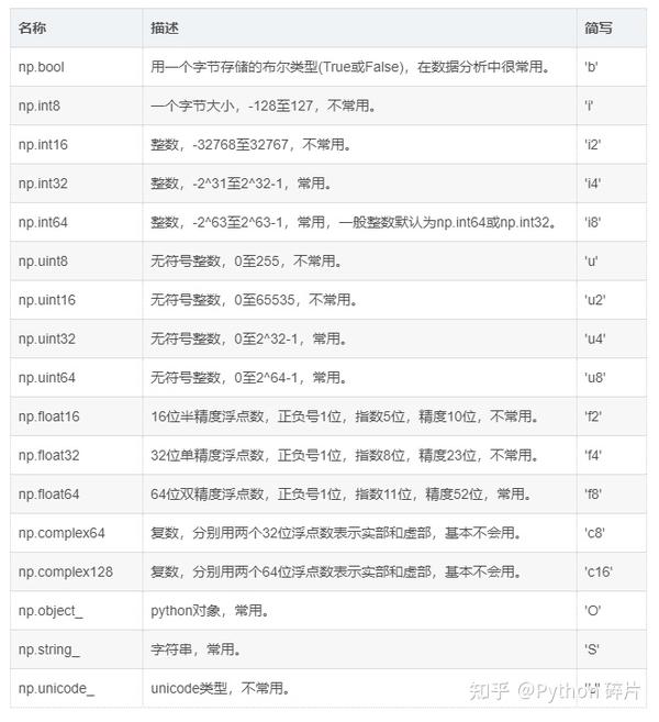 前面已经提到,在一个ndarray对象中,存储的是同一类型的数据,ndarray中常见的数据类型有下表这些。