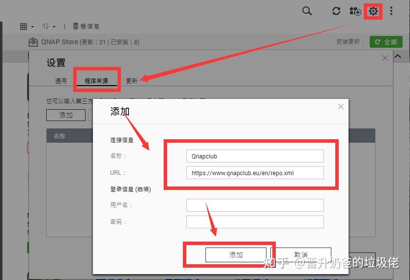▼曾经我也是标准的docker党,能用docker绝对不用qpkg套件,不过玩的多了以后发现,还是怎么省事儿怎么来的最舒服,所以首推qpkg套件安装。威联通的官方应用商店是没有QB和Tr的,这样我们就需要用到qnapclub这个第三方软件源。直接在AppCenter中添加程序来源,具体操作如下图所示。