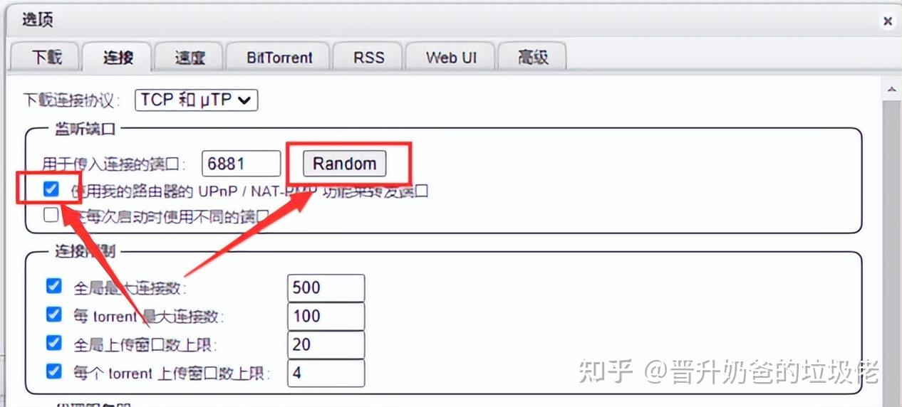 ▼qbit默认的监听端口是6881,大多数PT站点是屏蔽掉的,为了下载有速度,咱们这里随便roll一个用于传入连接的端口,同时开启UPnP功能转发端口,下载就能跑的起来了。