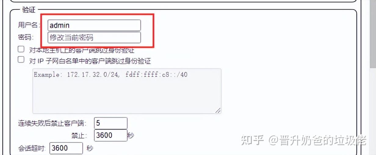 ▼然后到刚刚修改语言的位置,往下拉一点点,就可以看到修改账号密码的地方了,为了省事(偷懒)也可以对局域网内网中的IP地址设置白名单,省去身份验证的步骤。