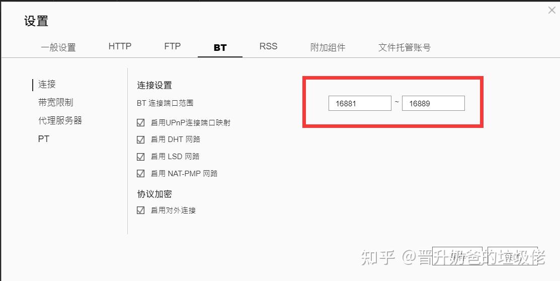 ▼需要注意的是如果想进行PT下载还是需要进行以下端口修改,进入到右上角的设置,进入BT标签页,将链接端口范围就行一下修改,并通过UPnP进行端口映射,不过个人感觉挂PT效果一般,不推荐挂PT使用。