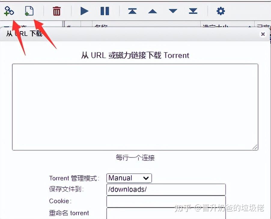 ▼在如图所示位置,可以添加种子链接或者是直接上传种子,添加后下载就可以开始啦。奶爸轻度下载用户,一般都直接添加链接做下载。