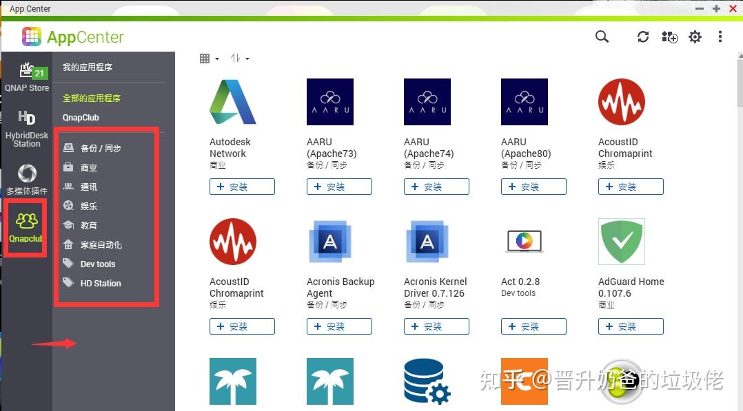 ▼添加之后我们可以看到在最左侧的标签栏多出了一个名为qnapclub的软件源,这样我们就可以在里面快捷方便的安装应用了,找到qBit和Tr进行下载安装吧。