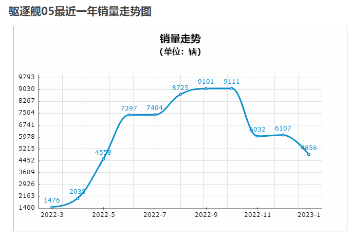 作为一款紧凑级轿车,驱逐舰05是10-15万价格区间少有的插混车型,相比同级的传统合资燃油车,驱逐舰05凭借可油可电、出行无忧的普适性和体验全面升级的综合产品力,得到了很多消费者的关注。但实际上,驱逐舰05最高的销售月份在2022年10月,达到了9111辆,随后,该车销量一路下跌。