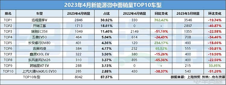 目前来看,新能源中面还是以极高的市场占有率为主,不过有足够表现力的车型并不多,基本还是以远程星享V和开瑞江豚为旗手,其余的中面车型较难有突出的表现。微面方面也类似,瑞驰EC35II继续以高销量领跑,但新能源微面持续下滑的颓势,TOP10车型中仅有四款新能源微面入榜。