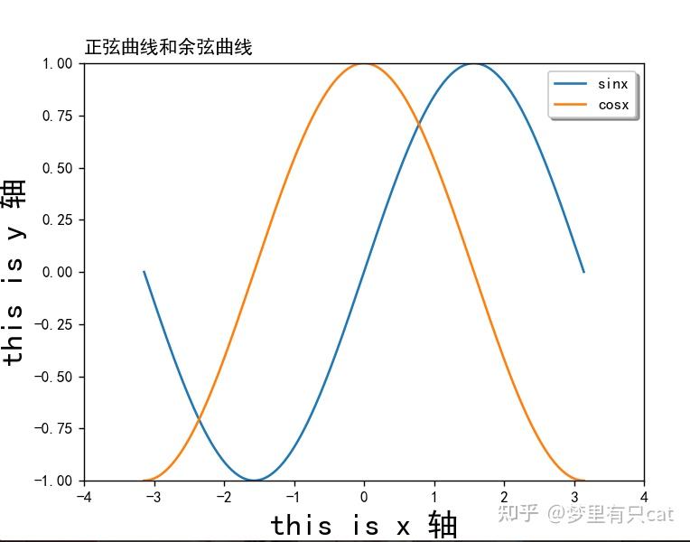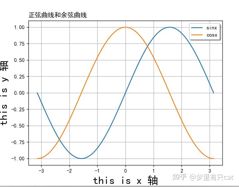 plt.legend(pic,["sinx","cosx"],shadow=True,fancybox="blue")