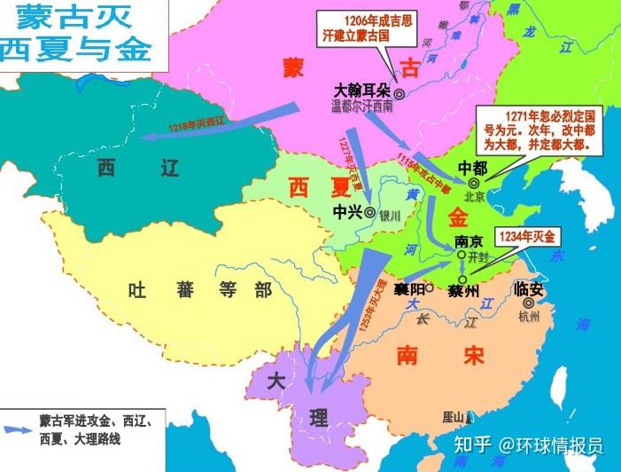 大理和宋朝间的微妙关系一直持续到13世纪。蒙古人崛起,开始向中原进军,在吞并了金和西夏之后,蒙古人开始转向西南,于1254年吞并大理国,形成了一个对南宋的包围圈。