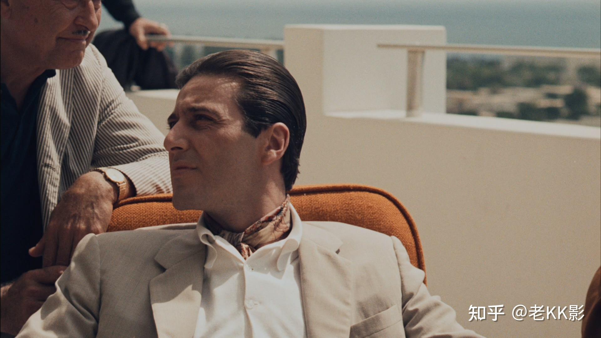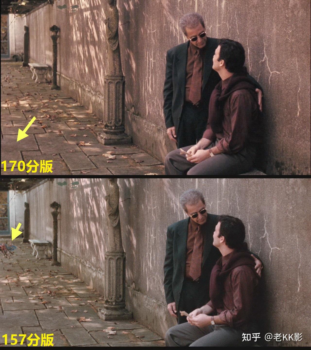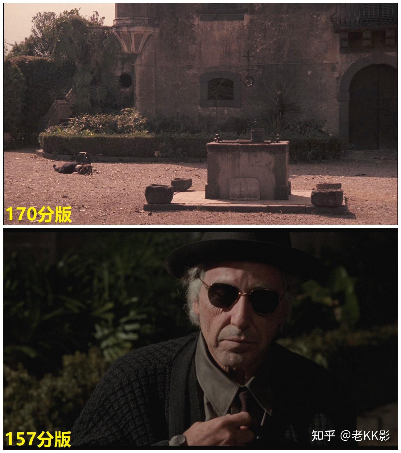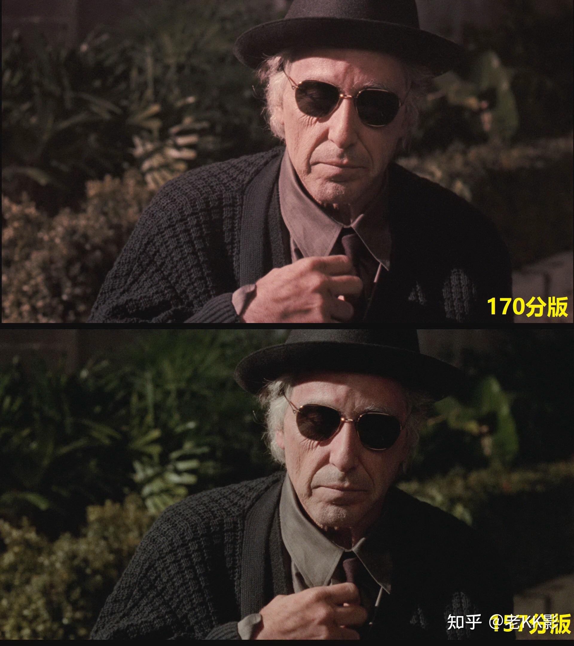还是剪辑问题,157分新版结尾是先来了一个麦克独坐庭院的中远景逐渐拉近,可以看到麦克是已经戴着墨镜的,可马上又接了一个麦克缓缓戴上墨镜的特写,人物动作逻辑与顺序就显得混乱了。170分老版的剪辑就是OK的,由闪回的舞蹈场景直接叠印的是即将戴上墨镜的麦克特写,然后才是庭院中的麦克,动作合乎逻辑。
