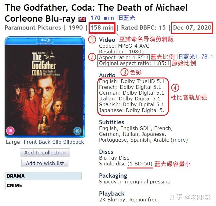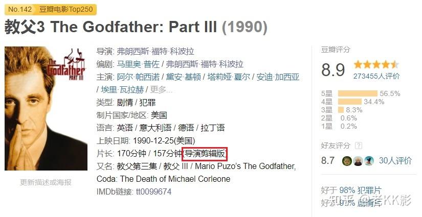 教父3的初始剧场版是162分钟,后来的VHS特别版是170分钟,之后的大部分蓝光版就都是170分钟了。而这个2020岁尾的最新版是157分钟,在豆瓣被定义为了导演剪辑版。