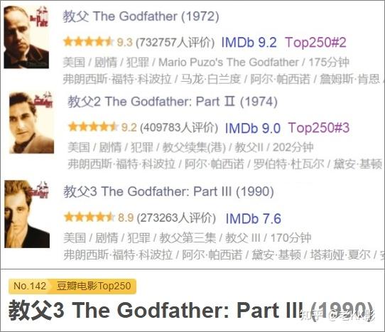 教父3的评分和口碑一直不如拍摄年份近20年前的前2集,豆瓣三集的评分高于IMDb,符合豆瓣上美国电影的一贯评分习性,尤其是教父3的评分,豆瓣的8.9明显高于IMDb的7.6,豆瓣评分7以上几乎是每0.1的变化都很敏感,何况是高了足足1.3分!豆瓣上三部曲全部进入了豆瓣Top250,而IMDb上前2集分列亚季军,第3集则远离IMDb Top250。