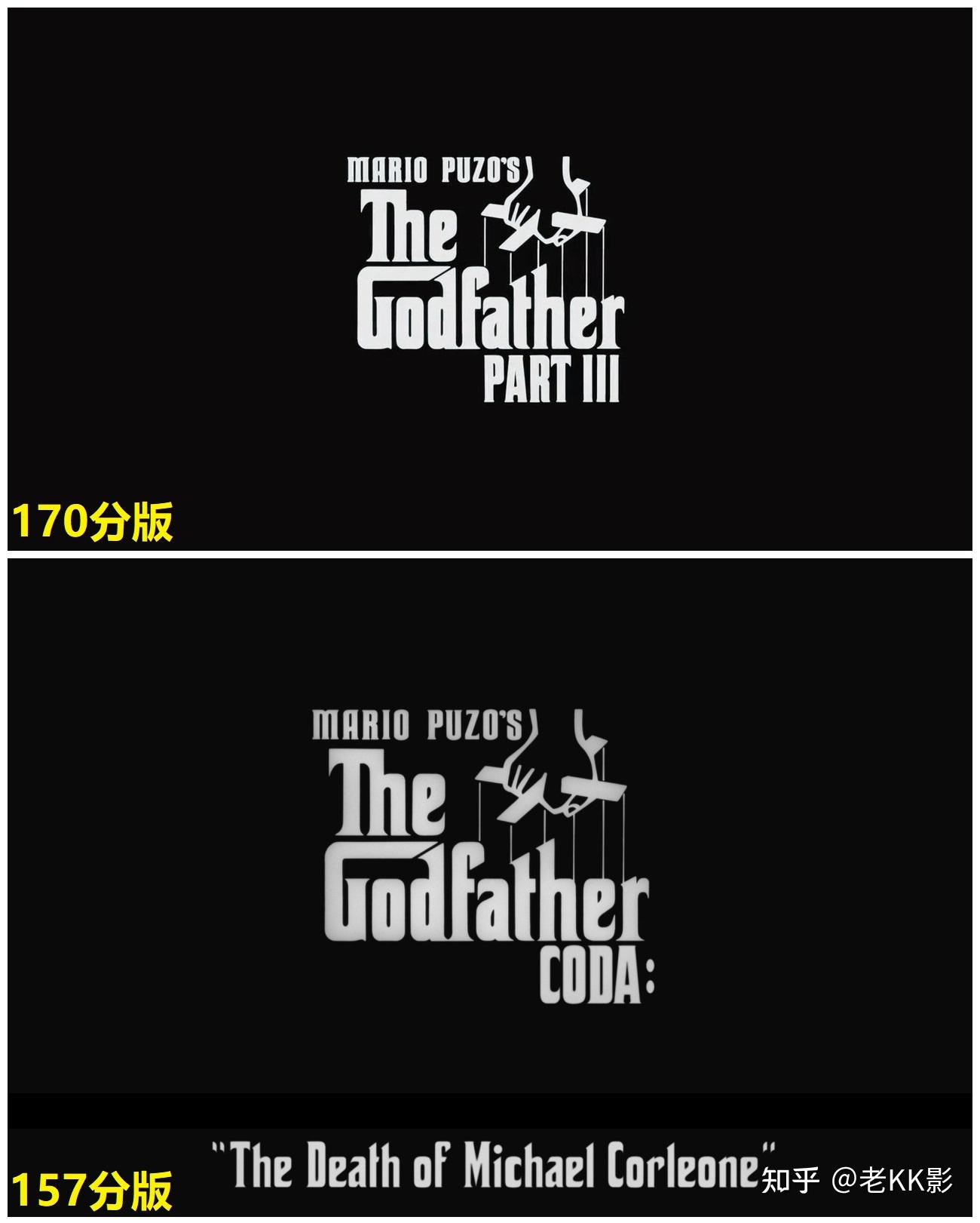 教父终章:迈克尔·柯里昂之死,Mario Puzo’s The Godfather Coda: The Death of Michael Corleone,是教父3最新版蓝光的片名,之前都叫教父第3部分,The Godfather: Part III。有3似乎就可能会有4,而教父终章,coda的提法则明确的断了继续的念想,从科波拉的角度讲教父应该不会有4了。而迈克尔·柯里昂之死的片名是最原始的、导演科波拉和原著普佐本来就想用的片名,第3集开拍之前派拉蒙几乎答应了科波拉所有的要求,唯独坚持了片名,使用了派拉蒙想用的教父III。