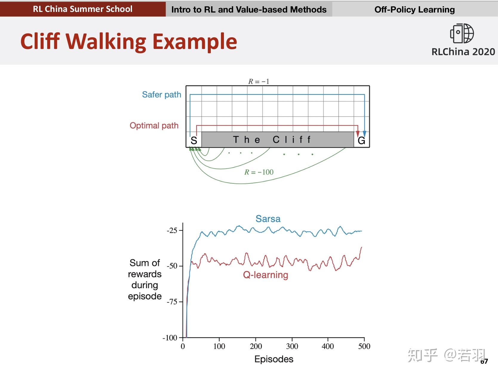 这是最近某个强化学习讲座的课件,北大卢宗青老师用的Richard Sutton书里的例子,saras是on-policy学习,q-learning是off-policy学习。sarsa的学习比较保守稳健,每一个episode和每个episode的每个step都会执行episilon-greedy探索;q-learning则倾向于利用经验的累积,学习到最优策略。在悬崖行走曲线上,q-learning方法是optimal的,但会有风险,sarsa方法是安全的,但学习的episode曲线也被拉长了。