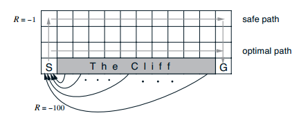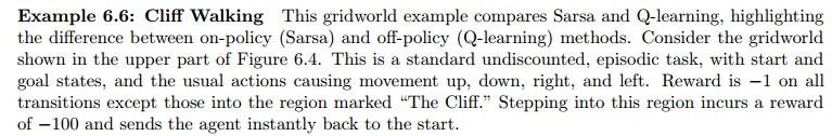 那我们就举Sutton书上的Cliff Walking例子来比较一下这两个方法,看看到底收敛速度如何?