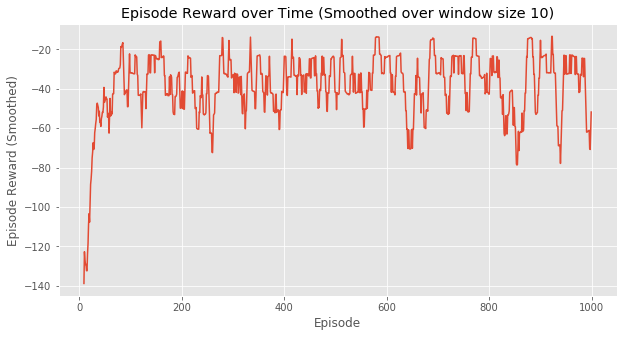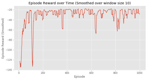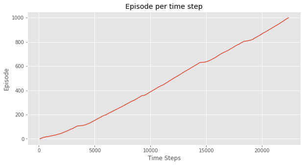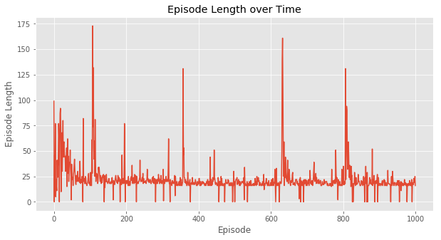 这是每次episode的耗费的时间,可以看出在一开始训练,两种方法都完成一次episode都比较耗时,但Q-Learning在不到100次episode以后基本稳定在每次episode20毫秒左右。而SARSA由于算法的保守性,会有一点几率采取random policy,所以可以看到,即使已经“收敛”,但还是会因为采取了新action导致episode变长。