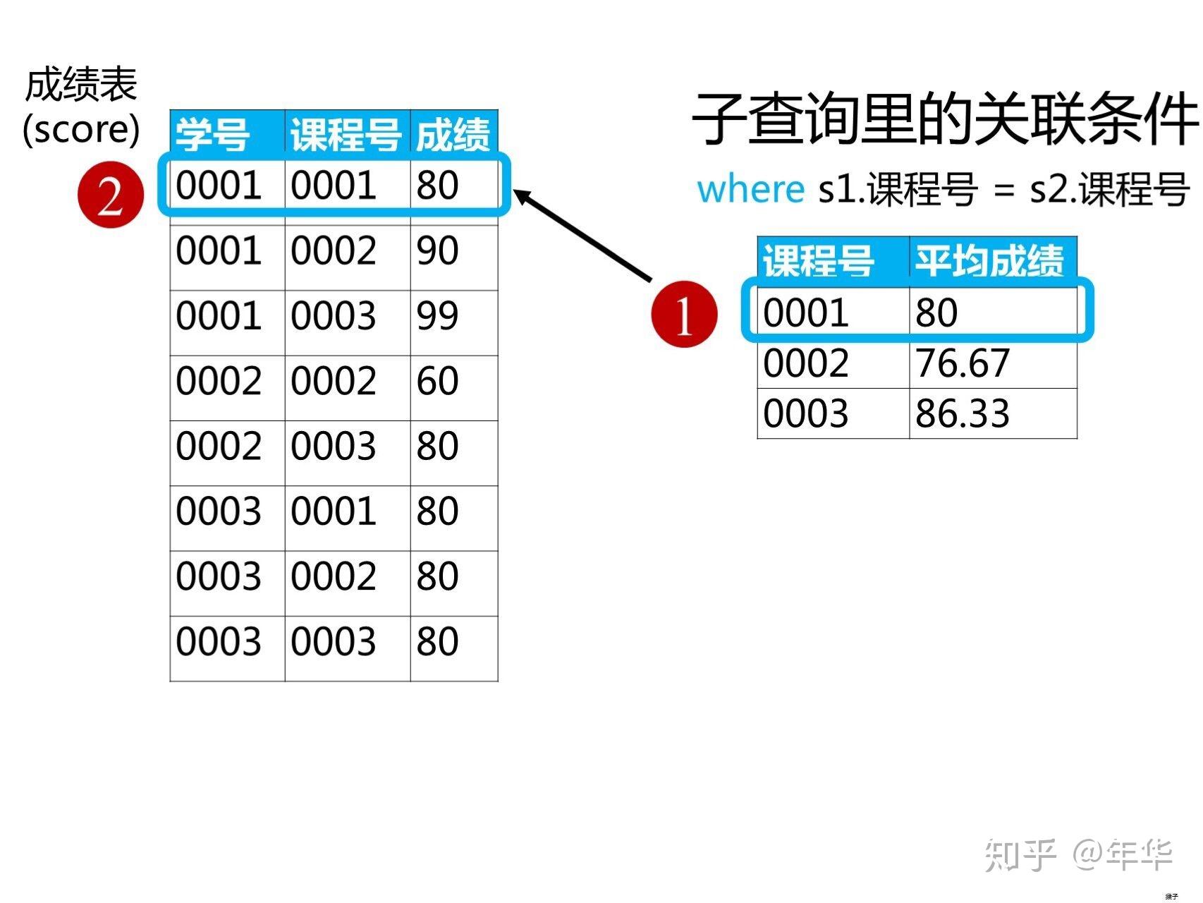 2:由于where条件的存在,当返回第一组数据时,根据课程号匹配所有的课程成绩,符合条件的留下输出