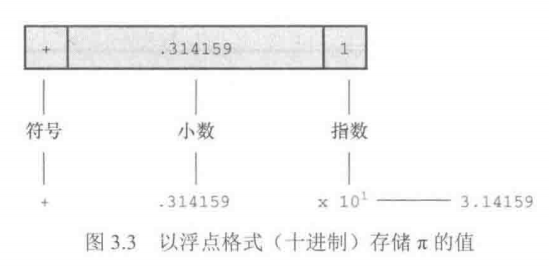 这里关键要理解浮点数和整数的存储方案不同。 计算机把浮点数分成小数部分和指数部分来表示,而且分开存储这两部分 。因此,虽然7.00和7在数值上相同,但是它们的存储方式不同。在十进制下,可以把7.0写成0.7E1。这里,0.7是小数部分,1是指数部分。图3.3演示了一个存储浮点数的例子。
