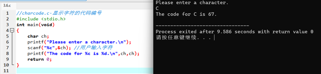 运行该程序时,在输入字母后不要忘记按下Enter或Return键。随后,scanf()函数会读取用户输入的字符, &符号表示把输入的字符赋给变量ch 。接着,printf()函数打印ch的值两次,第1次打印一个字符(对应代码中的%c,第2次打印一个十进制整数值(对应代码中的%d)。