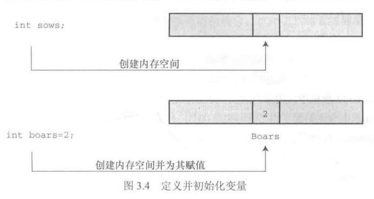 简而言之, 声明为变量创建和标记存储空间,并为其指定初始值 (如图3.4所示)。