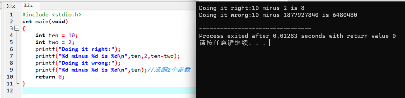 printf("%d minus %d is %d\n",ten,2,ten-two);
