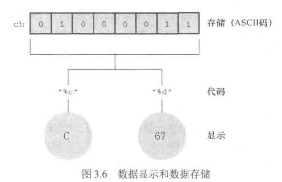 注意,printf()函数中的转换说明决定了数据的显示方式,而不是数据的存储方式(见图3.6)。