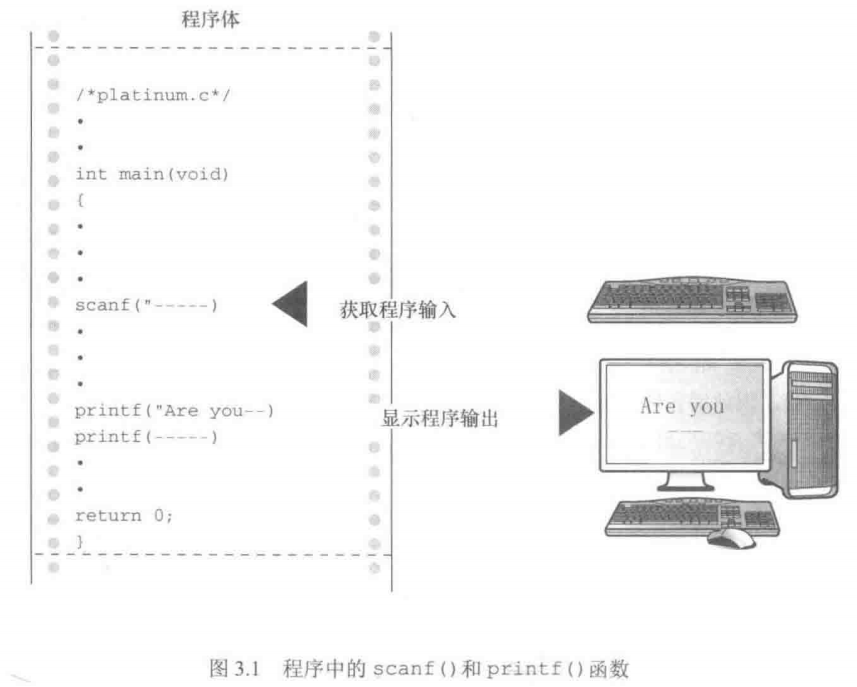 ■ 也许本程序最突出的新特点是它的交互性。计算机向用户询问信息,然后用户输入数字。与非交互式程序相比,交互式程序用起来更有趣。更重要的是,交互式使得程序更加灵活。例如,示例程序可以使用任何合理的体重,而不只是156磅。不必重写程序,就可以根据不同体重进行计算。scanf()和printf()函数用于实现这种交互。scanf()函数读取用户从键盘输入的数据,并把数据传递给程序;printf()函数读取程序中的数据,并把数据显示在屏幕上。把两个函数结合起来,就可以建立人机双向通信(见图3.1),这让使用计算机更加饶有趣味。
