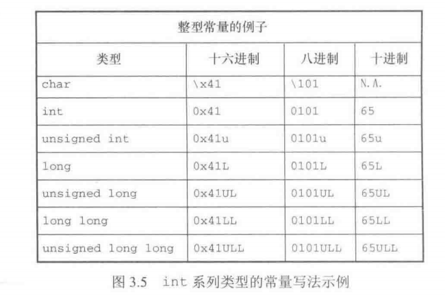 从C90开始,不仅可以用十进制、八进制形式表示字符常量,C语言还提供了第3种选择——用十六进制形式表示字符常量,即反斜杠后面跟一个x或X,再加上1~3位十六进制数字。例如,Ctrl+P字符的ASCII十六进制码是10(相当于十进制的16),可表示为'\x10'或'\×010'。图3.5列出了一些整数类型的不同进制形式。