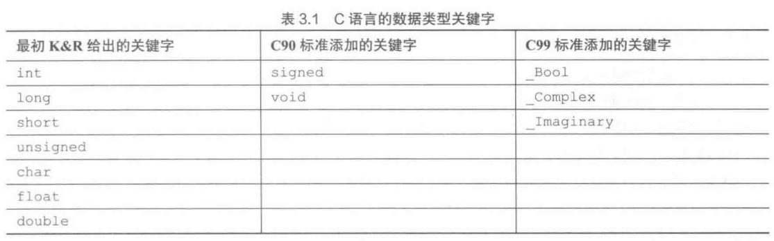 现在,我们先来了解一下 C语言的基本类型关键字 。K&RC给出了7个与类型相关的关键字。C90标准添加了2个关键字,C99标准又添加了3个关键字(见表3.1)。