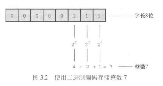和数学的概念一样, 在C语言中,整数是没有小数部分的数 。例如,2、-23和2456都是整数。而3.14、0.22和2.000都不是整数。计算机以二进制数字存储整数,例如,整数7以二进制写是111。因此,要在8位字节中存储该数字,需要把前5位都设置成0, 后3位设置成1(如图3.2所示)。