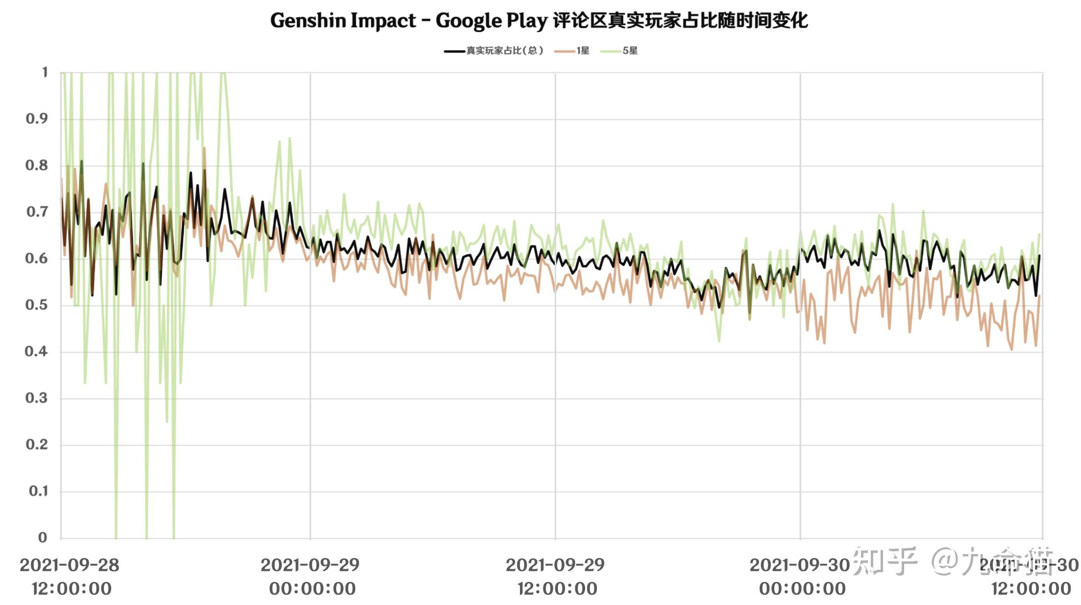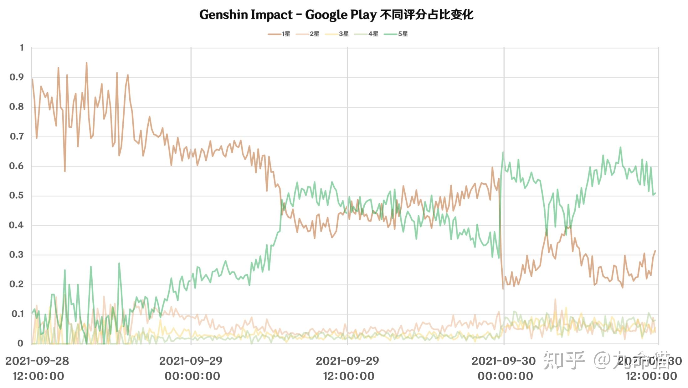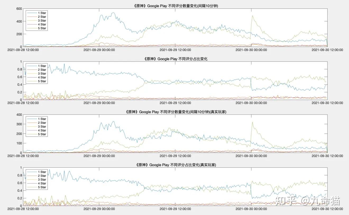 约40%评论用户的游戏版本不是2.1,也就是说只有60%的评论是“正常玩家”发出的,而且占比还在随着时间逐步下降 。可以看到30号0点,原神官方妥协之后,1星评论的“真实玩家占比”还在继续下降,也就是说刷一星的只剩下了那些非玩家拱火人或者弃坑人。5星评论以及总的“真实玩家占比”都在逐步上升,说明官方的妥协还是让一部分真实玩家回心转意了的。