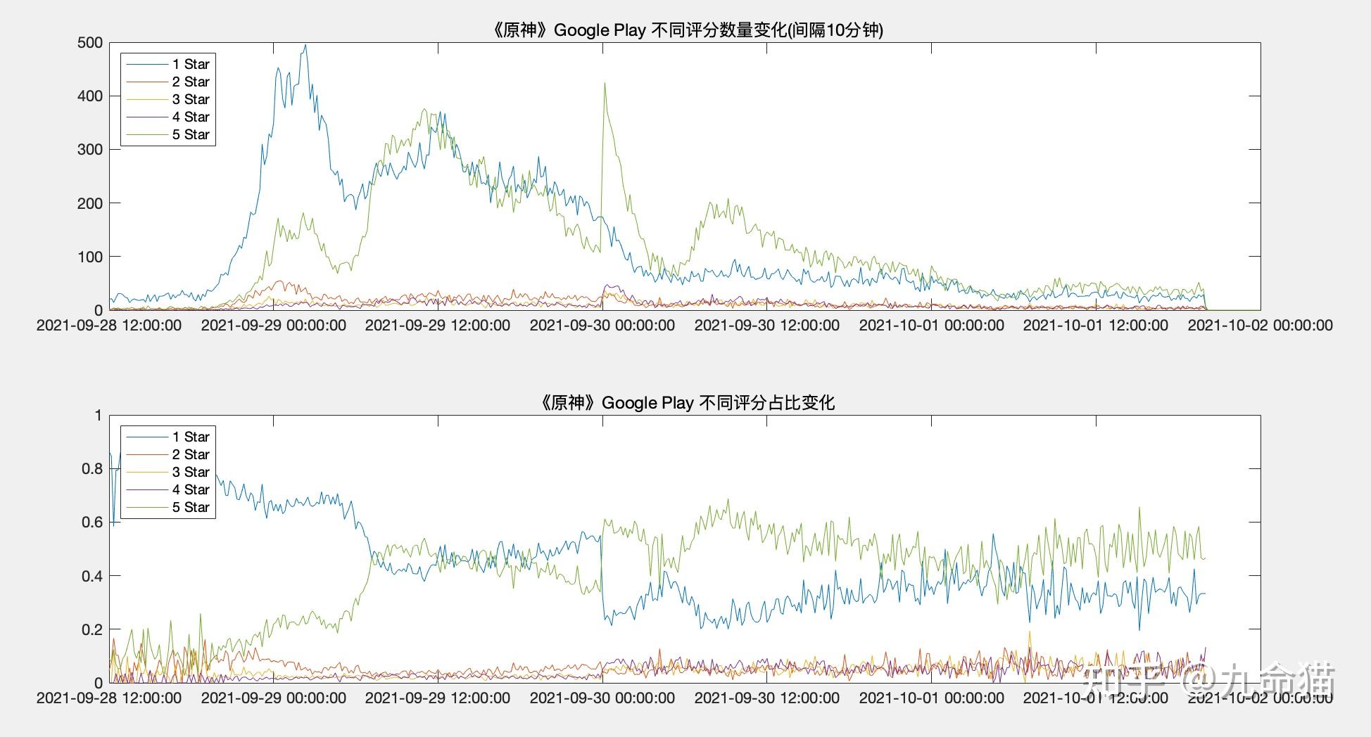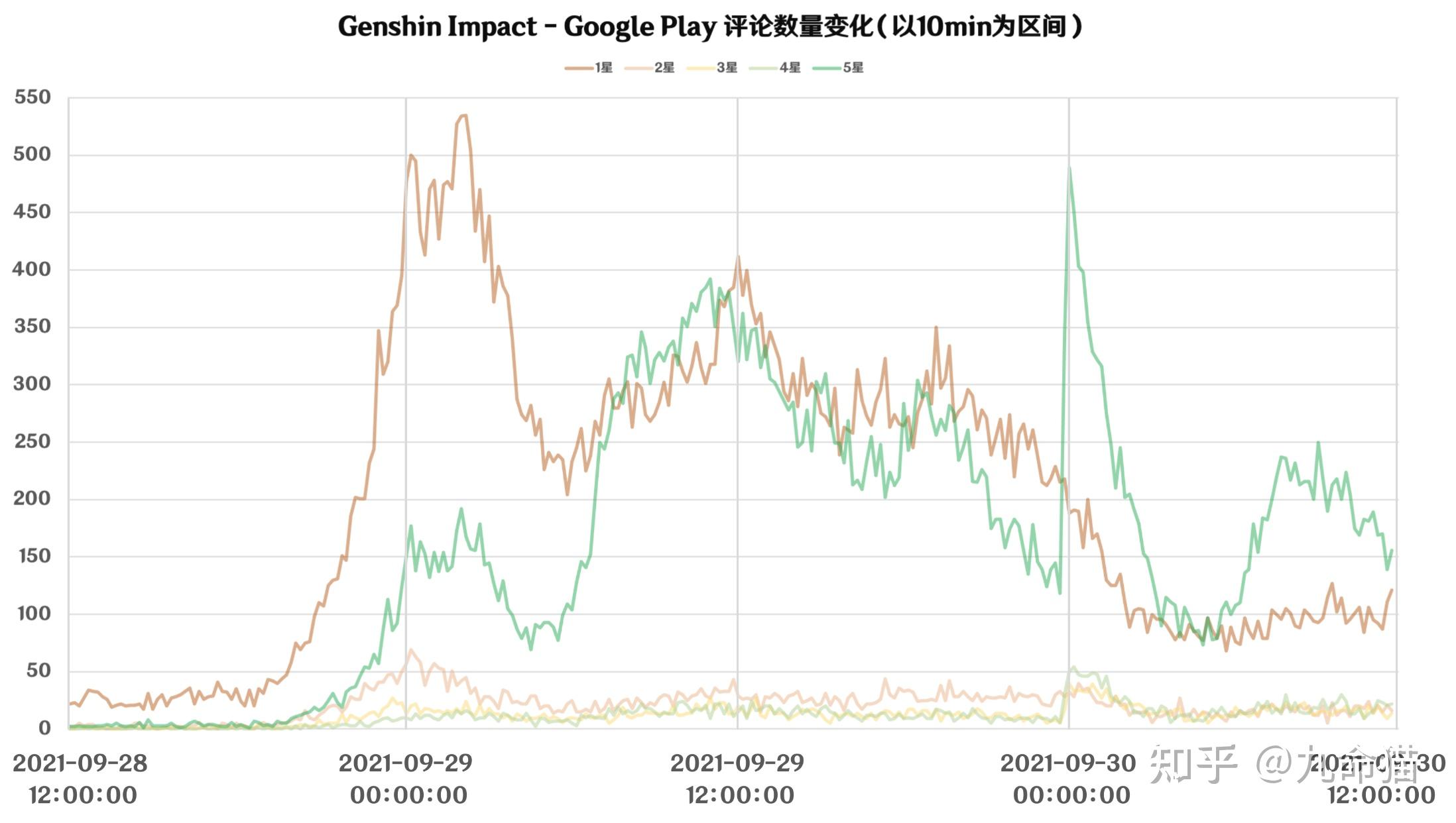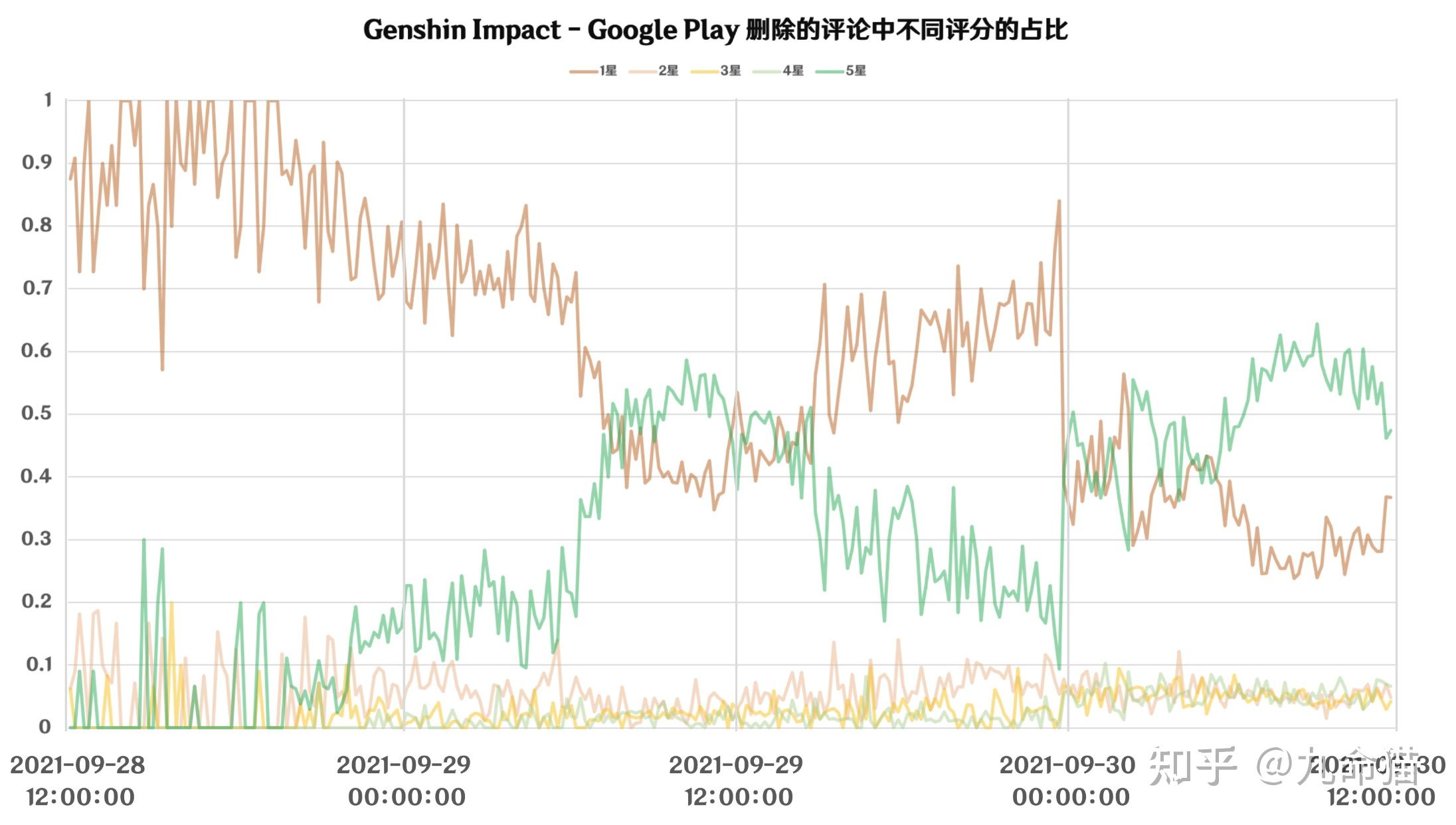 约40%评论用户的游戏版本不是2.1,也就是说只有60%的评论是“正常玩家”发出的,而且占比还在随着时间逐步下降 。可以看到30号0点,原神官方妥协之后,1星评论的“真实玩家占比”还在继续下降,也就是说刷一星的只剩下了那些非玩家拱火人或者弃坑人。5星评论以及总的“真实玩家占比”都在逐步上升,说明官方的妥协还是让一部分真实玩家回心转意了的。