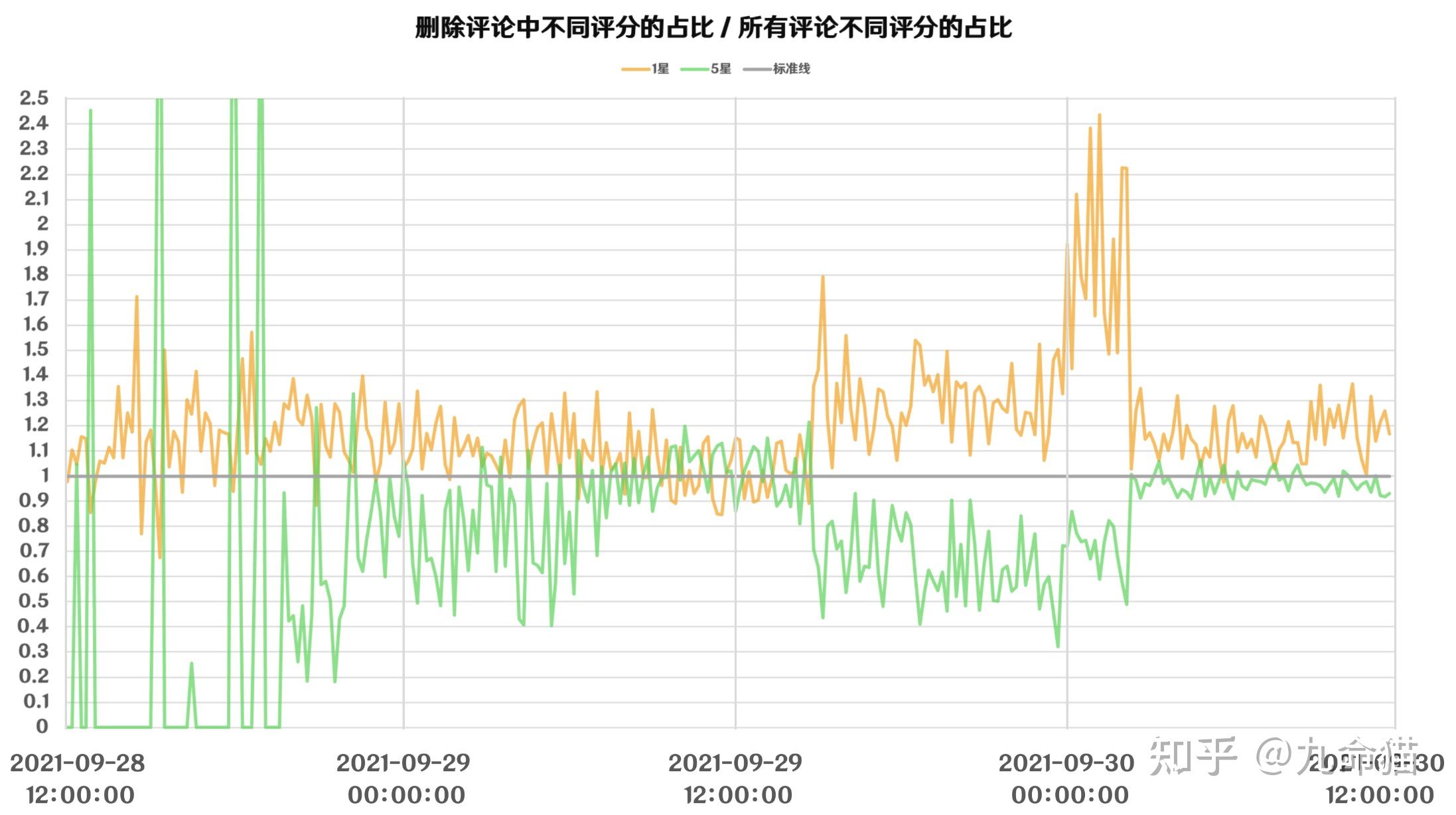 将删除评论中不同评分的占比与所有评论的评分占比做除,可以得到哪种评论更容易被删除,也就是删除评论的趋势