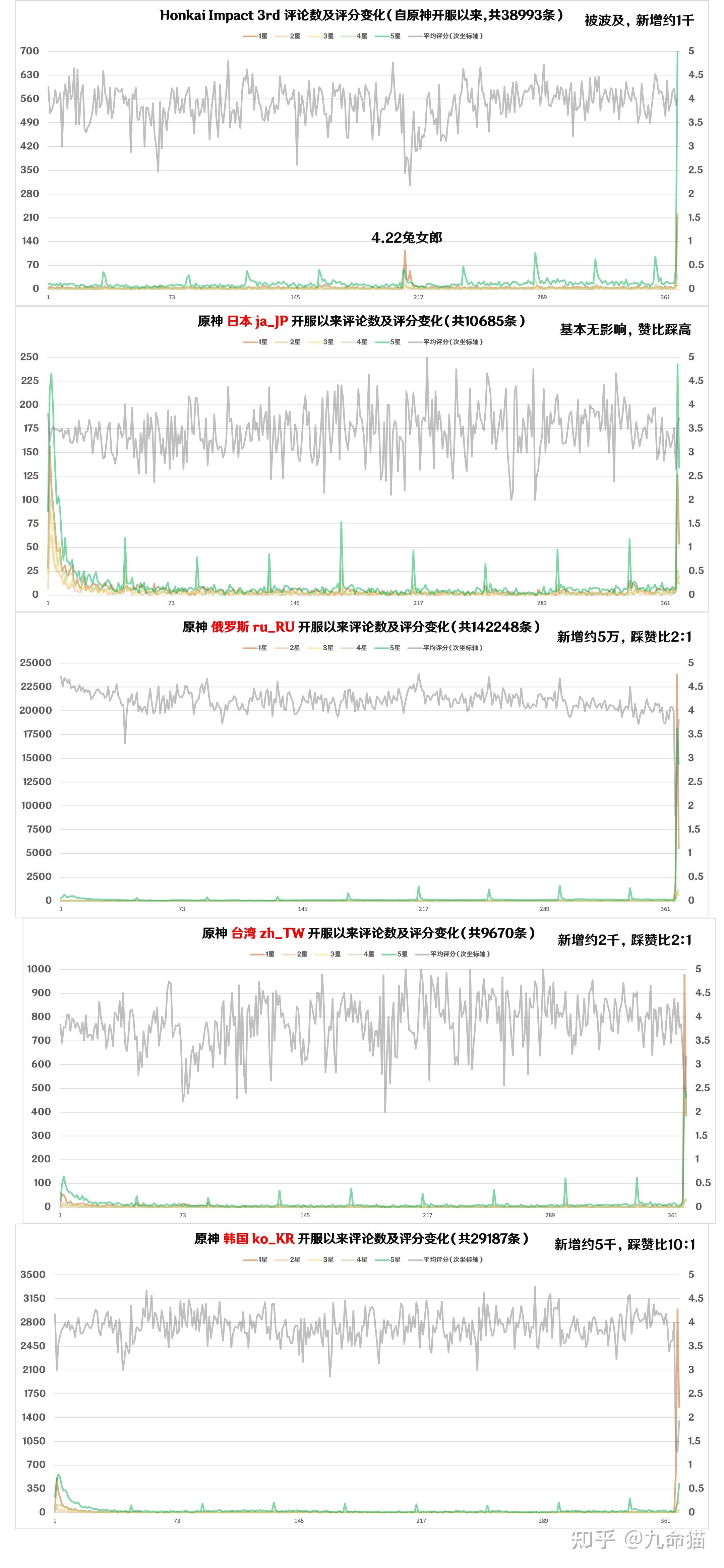 崩坏三被波及、日本、俄罗斯、台湾、韩国的评论数变化及评分趋势见下图