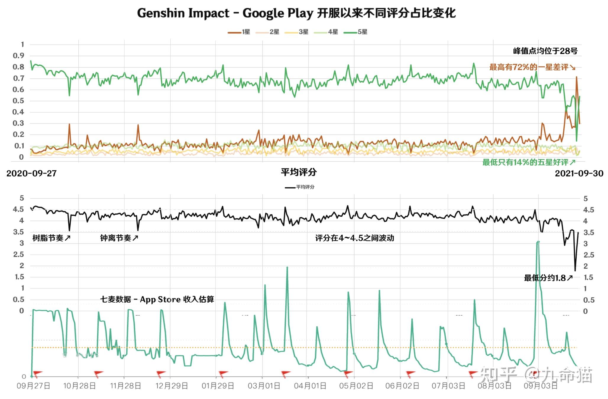 可以看到开服以来的外网节奏影响,标注出来的是当时10月的树脂节奏以及12月的钟离节奏,将评分一度拉到了3.5左右。2021年上半年基本风平浪静,评分在4~4.5之间波动,有缓慢的下降趋势。
