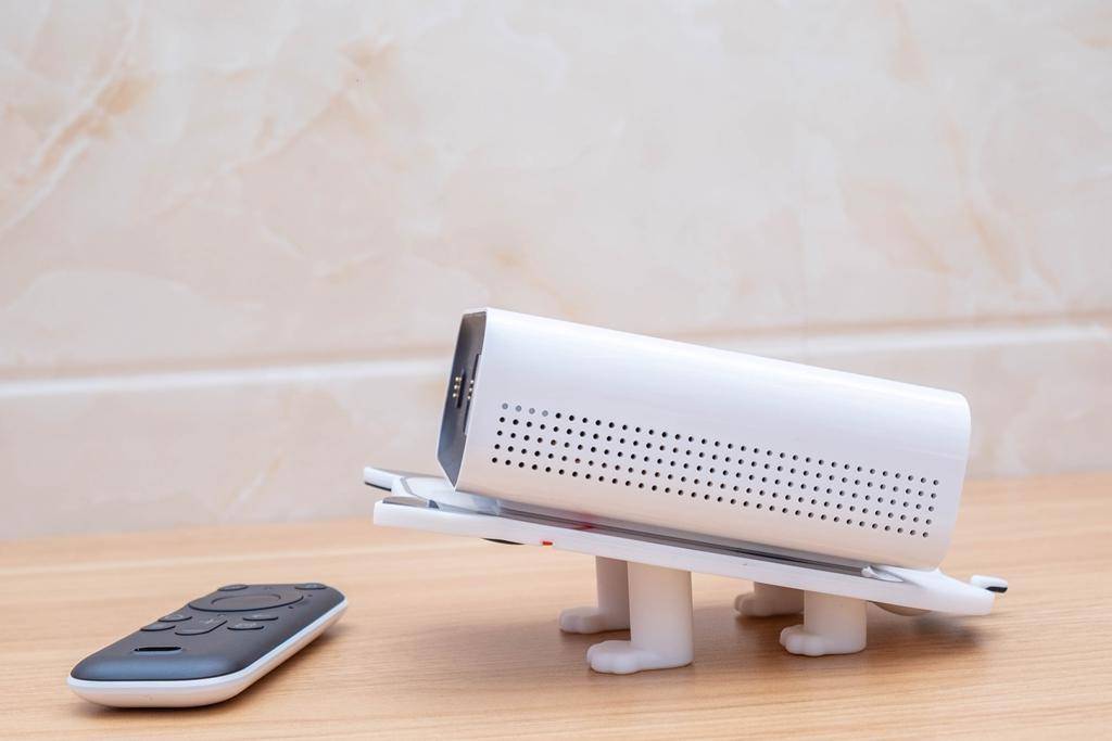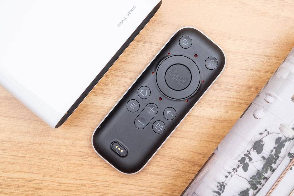 在开始体验之前,笔者先来说下天猫精灵小白盒的几大核心亮点,首先内置天猫精灵,可远距离语音控制;其次支持四方梯形矫正,随意放也不担心无法正常观看;再次就是带有全自动激光对焦,随意移动都无需手动调节;最后就是遥控器,不仅采用了创意吸附设计,可当做镜头盖,保护镜头之外,同时还可为遥控器补充电量,对比同类产品要更占优势。聊完核心亮点,接下来看看产品的外观细节部分。