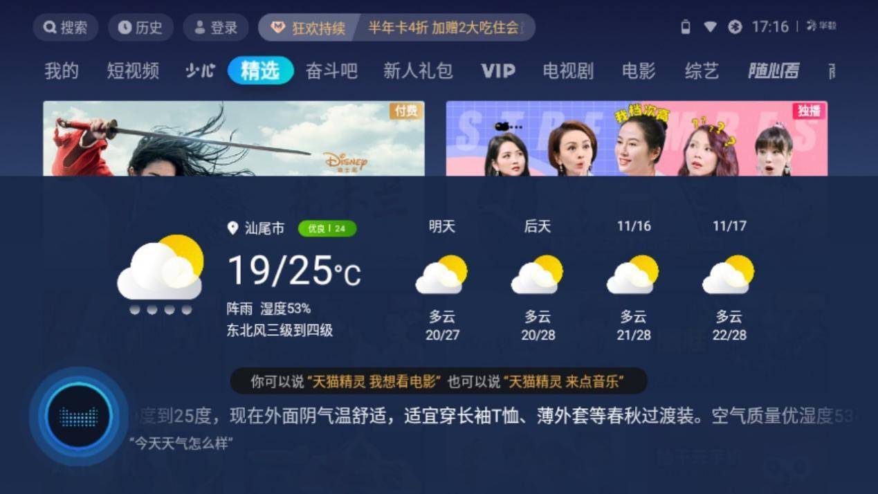 既然是天猫精灵小白盒,怎么能少了语音的支持,不过这个AI语音助手,跟其他语音不同在于可以远距离唤醒,无需任何按键下,只需隔空对天猫精灵小白盒喊一句“天猫精灵”即刻唤醒。在这里你可以查询天气、搜索电影、电视剧,甚至还可以提问任何问题,都能为我们一一解答并搞定。