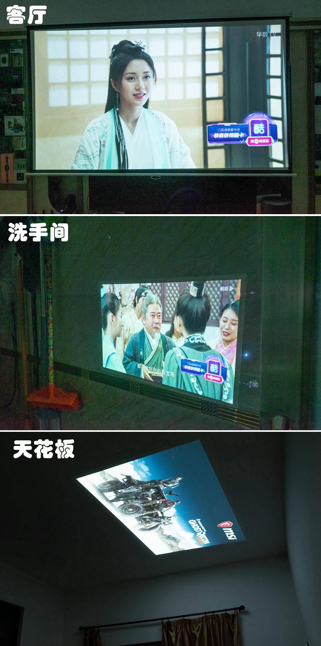 既然是便携投影,可以轻松面对不同环境下的使用,比如在客厅看、洗手间看、天花板看,只需有空白区域或者一块板都可观看,哪怕是瓷砖墙,都挡不住它出色的投射画面。