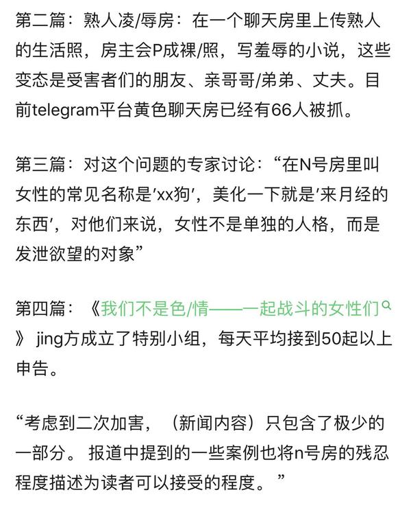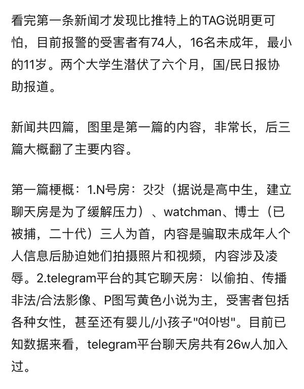 简单了解一下这个事件: “N号房事件是从去年年初开始,在Telegram上发生的性剥削事件,受害者主要是未成年人,将受害者成为“奴隶”,威胁拍摄淫秽物品。”