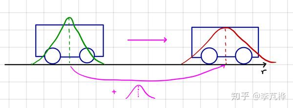 预测更新实际上相当于“ 加法 ”:将当前状态转换到下一时刻(并增加一定不确定性),再把外界的干扰(运动测量值)叠加上去(又增加了一点不确定性)。